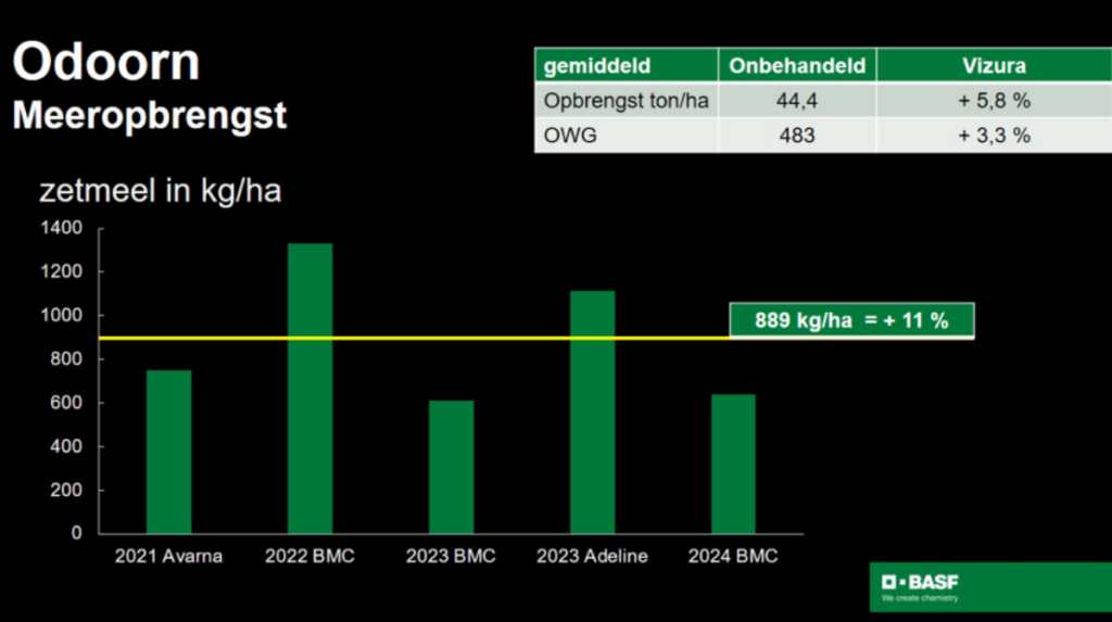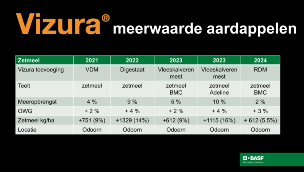 De afgelopen vier jaar hebben we in praktijkproeven in zetmeelaardappels gekeken wat de effecten zijn op de opbrengst. Milieuvoordelen zijn natuurlijk heel mooi, maar dat in combinatie met een hogere opbrengst is beter. In verschillende rassen en met verschillende organische meststoffen hebben we elk jaar een meeropbrengst gerealiseerd. Deze meeropbrengst zat deels in een hogere kilogram opbrengst en deel in een hoger zetmeelgehalte. Op onze lichte zandgrond hebben we de afgelopen jaar gemiddeld 11 procent meer zetmeel van een hectare gehaald. Nu zijn dit niet statische proeven, maar praktijkproeven waar zowel van behandeld als onbehandeld meerdere monsters met de hand gerooid zijn. Maar de trend is duidelijk.