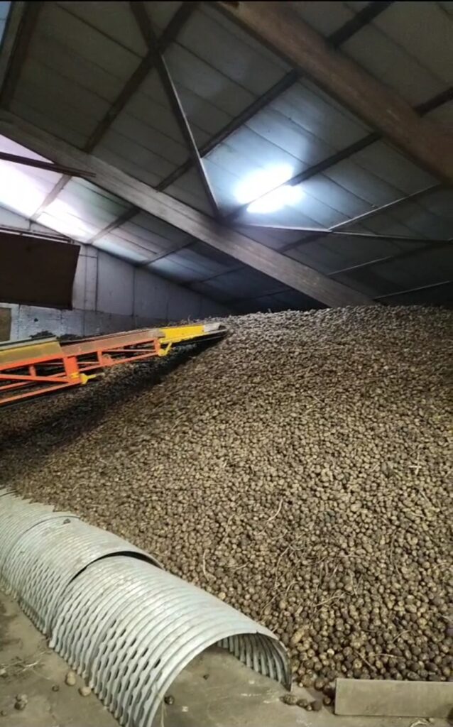 Afgelopen week zijn de laatste zetmeelaardappels geoogst. Deze aardappels zijn allemaal in de schuur gegaan. Ze blijven hier liggen tot eind januari, begin februari. Begin oktober hebben we al zetmeelaardappels aan Avebe geleverd af land. Het zetmeelgehalte van dit perceel lag rond de 20 procent. De opbrengst was aan de zuinige kant. Sowieso valt de opbrengst van de zetmeelaardappels tegen. Dit heeft verschillende oorzaken. Het voorjaar was laat, nat en koud. Dit gaf toch wat opkomst problemen. Vervolgens is het lang droog geweest. Met beregening hebben we de aardappels groen weten te houden. Pas tweede helft juli kwam er regen, veel regen. Toen sloeg de Phytophthora toe. Dit heeft veel schade gedaan. Voor de zetmeelaardappels een jaar om snel te vergeten. Nu maar hopen dat de “fabriekers” begin volgend jaar mooi uit de schuur komen.
