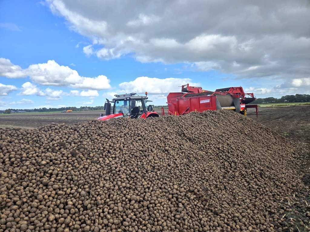 Op 15 augustus werden de eerste pootaardappelen gerooid. En dat was mooi op tijd. Dat komt mede doordat we vroeg konden poten. Landelijk was het erg nat, maar op onze lichte grond viel dat mee. Eind maart gingen de eerste aardappels al de grond in en een maand later waren we klaar met poten. Het groeiseizoen werd een uitdaging. Door de vele regen waren sommige percelen maar moeilijk begaanbaar. Op één perceel moesten we zelf pleksgewijs overpoten omdat door de het vele water de knollen verrot waren. Ook de spuitwerkzaamheden waren niet altijd eenvoudig en soms hebben we een stuk over moeten slaan. De Phytophthora druk was enorm door de natte weer en de extreem snelle groei van de aardappels. Dat in combinatie met steeds minder (en minder goede) middelen maakt de aardappelteelt een uitdagende teelt. Dankzij de regen bleven de aardappels goed groeien. Maar eind juli sloeg het weer om en werd het droog. Dus begin augustus moesten we alsnog met de regenhaspel het veld in. Gelukkig waren toen de meeste pootaardappelen al aan de maat. Voor de zetmeelaardappels was het nodig om een rondje te beregenen. En toen begon de oogst. Het pootaardappel rooien liep mooi door, ondanks gebrek aan personeel. De opbrengsten zijn erg goed en liggen ruim boven gemiddeld. En dat leidt er toe dat we niet voldoende aardappelkisten hebben, een luxeprobleem. Begin september moesten we de eerste zetmeelaardappels voor Avebe klaar hebben liggen. Ook hier een bijzonder goede opbrengst van ruim 50 ton netto aardappels met een zetmeelpercentage van 20,6 procent (owg 500 gram). In de derde week van september werden de laatste poters gerooid. En een week later zijn we gestart met het inschuren van de fabriekers. In de schuur slaan we alleen het ras BMC op. Dit ras staat bekend om zijn hoge zetmeelgehalte. De uitslagen van de proefrooing geven een OWG van 550 gram, een zetmeelgehalte van 23,4 procent. Ook hier is de opbrengst erg goed zo tegen de 50 ton per ha. Aanzienlijk meer dan we gewend zijn. Op vier oktober werden de laatste rijen geoogst. En traditiegetrouw stonden de oliebollen aan het eind van de dag weer op tafel. Als alle aardappels redelijk betaald worden dan lijkt 2024 geen slecht jaar te worden.